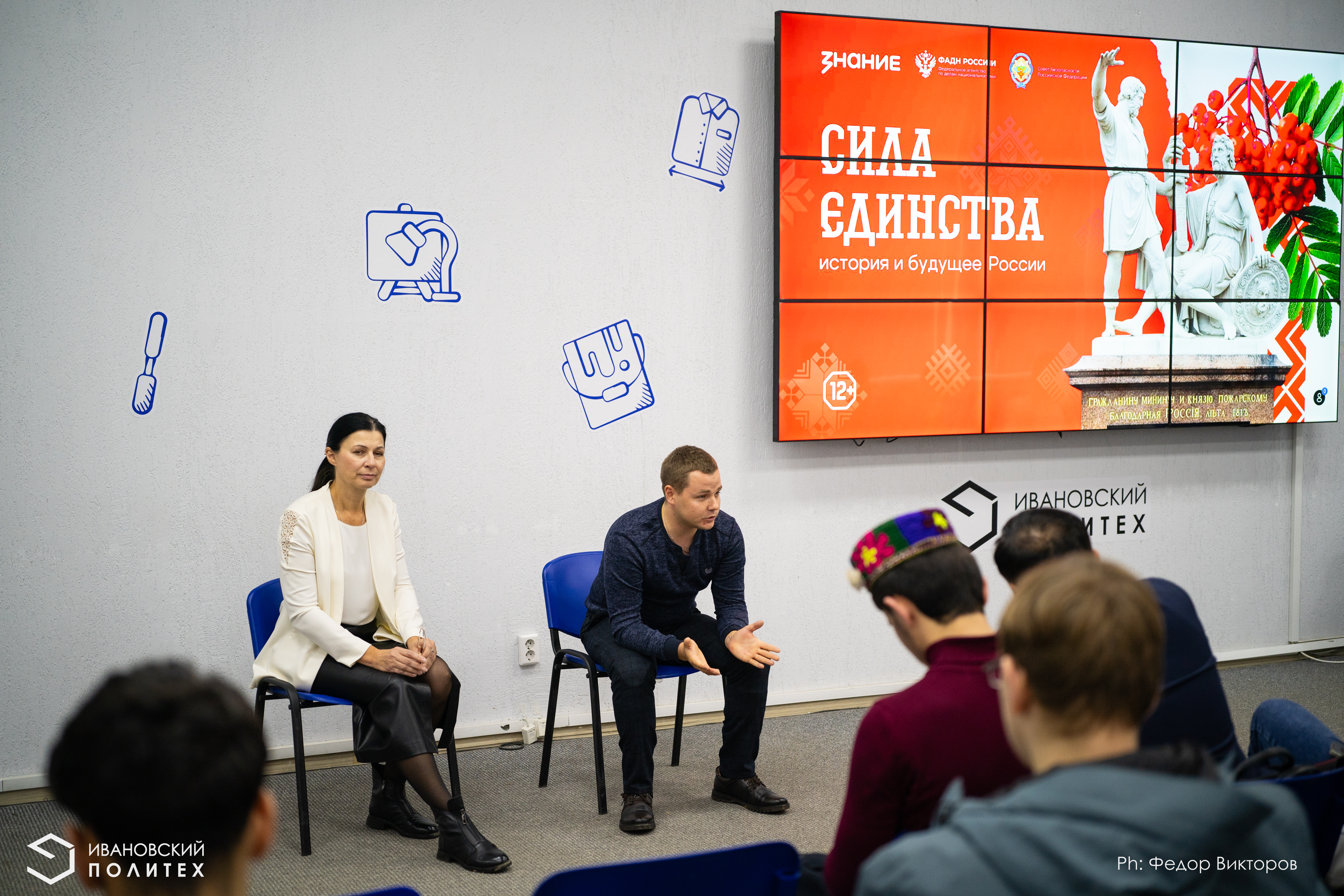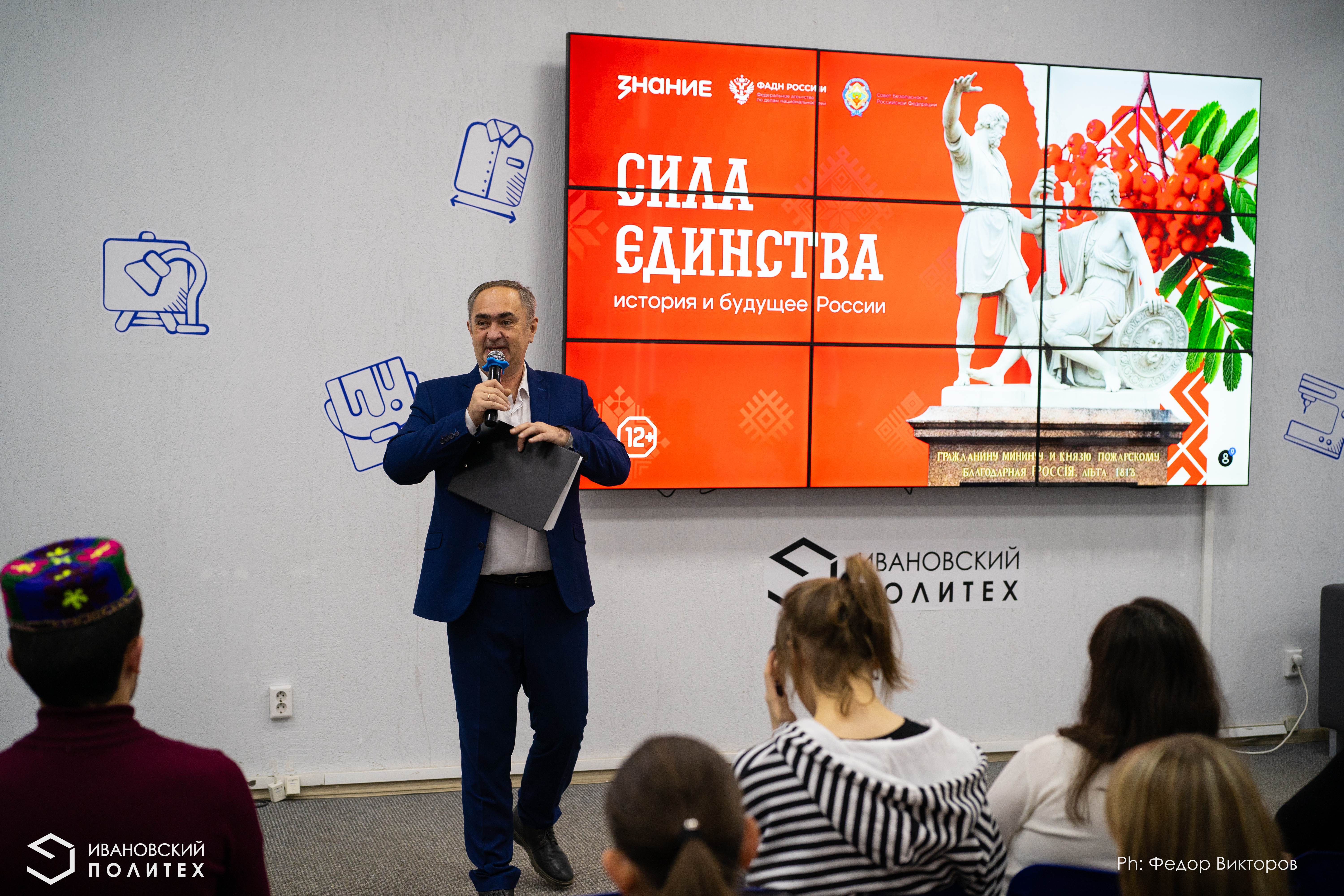 Начался марафон с Гимна Российской Федерации и презентации «Сила единства: история и будущее России» от Всероссийского общества «Знание». На ее основе начальник ОСП УМПиВД Анатолий Маслов и куратор студенческого патриотического клуба «Я горжусь» Мария Торопова и выстроили свой рассказ об истории праздника, уходящего своими корнями в далекое «Смутное время», и поговорили о купце Кузьме Минине и князе Дмитрии Пожарском, ставших героями и символами национального возрождения.